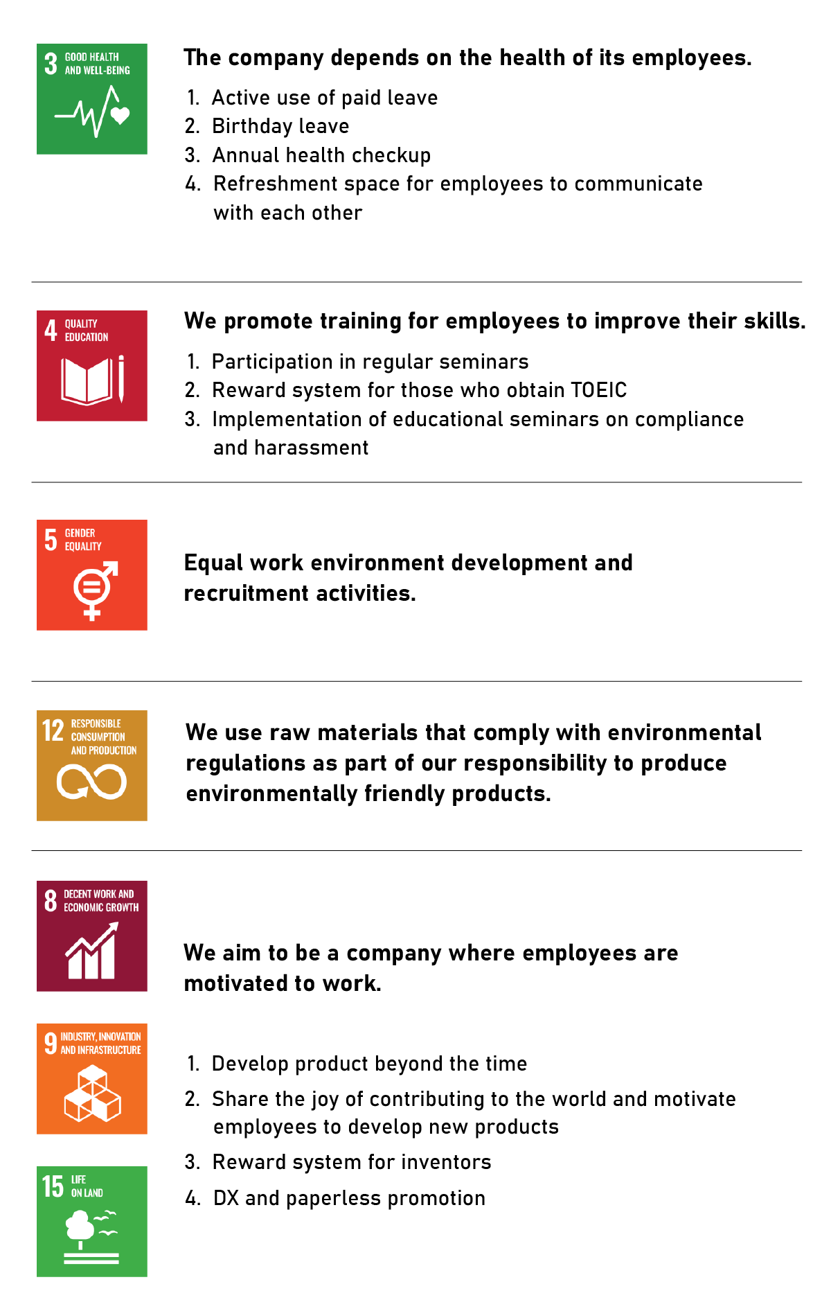 Approach to SDGsNikkan Industries' approach to the SDGsNikkan Industries, Ltd. endorses the 17 Sustainable Development Goals adopted at the 2015 United Nations Summit. We are focusing on the following items.
